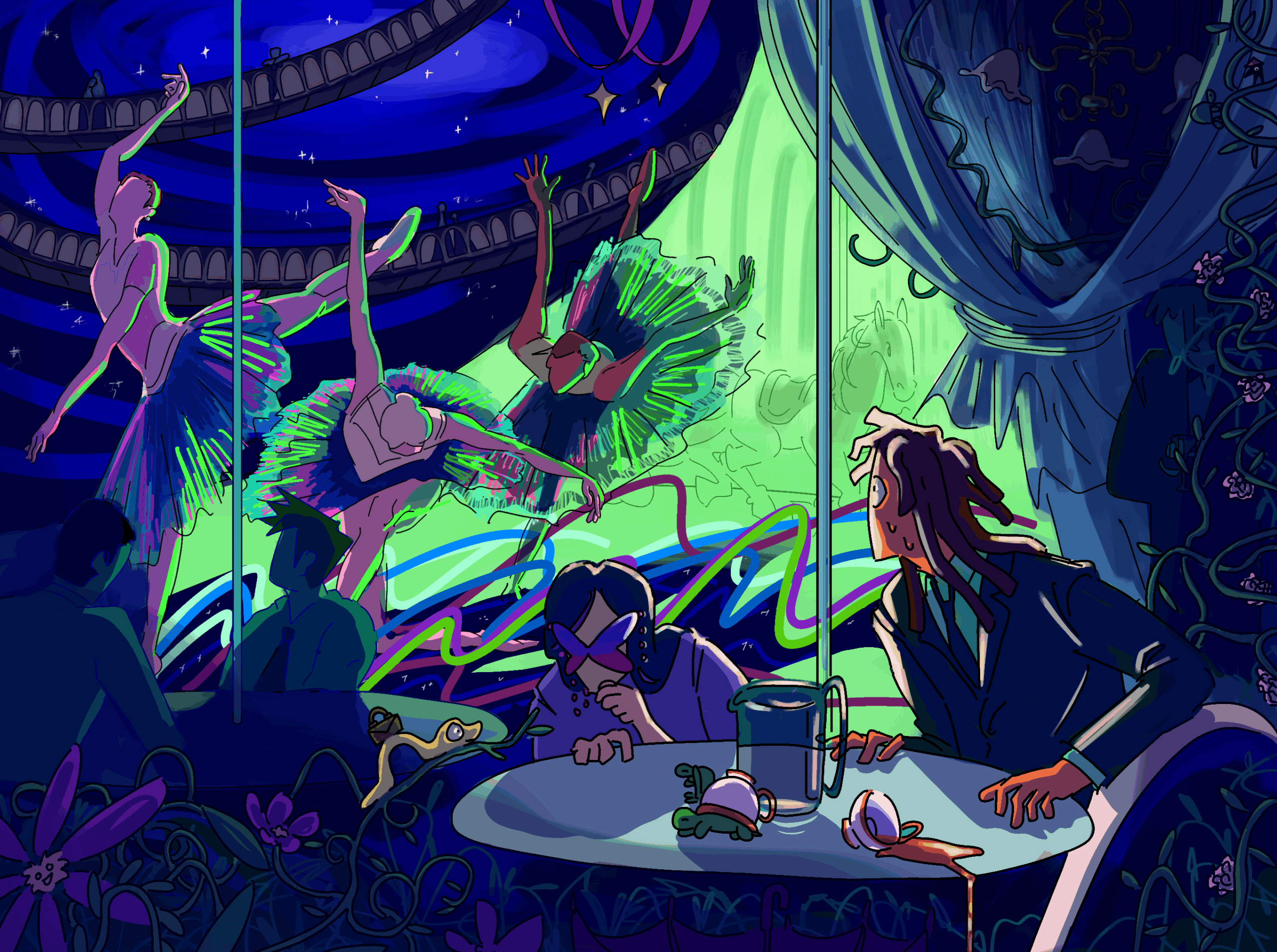 For this piece titled āC.R.E.A.Mā (Cash Rules Everything Around Me) I made a high-angle perspective to replicate the smallness and emptiness the subject feels. I dressed the figure in work clothes with their heels thrown to the side to convey exhaustion. Sheās holding a money stack to her ear (so she's wealthy, maybe even successful), but she's not happy. Cash rules everything in her world.