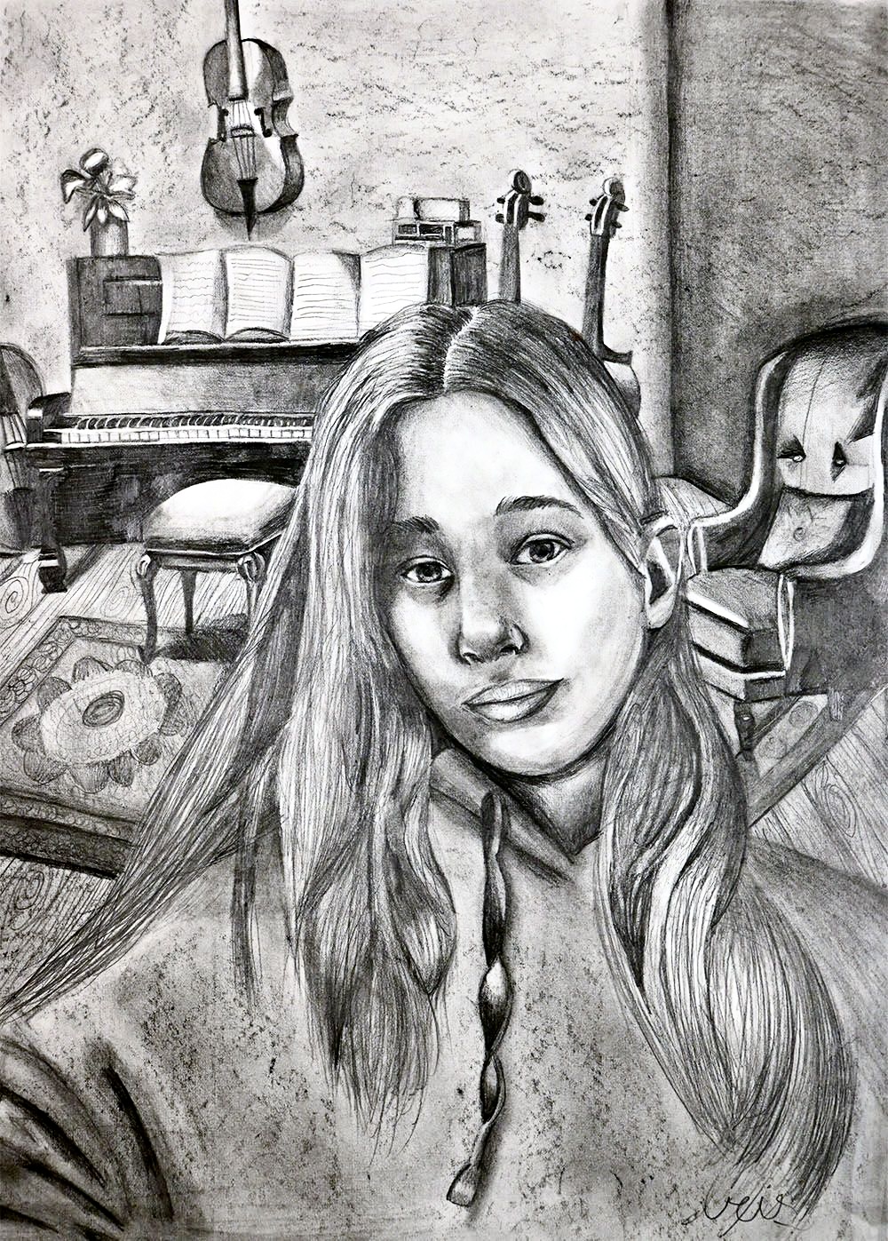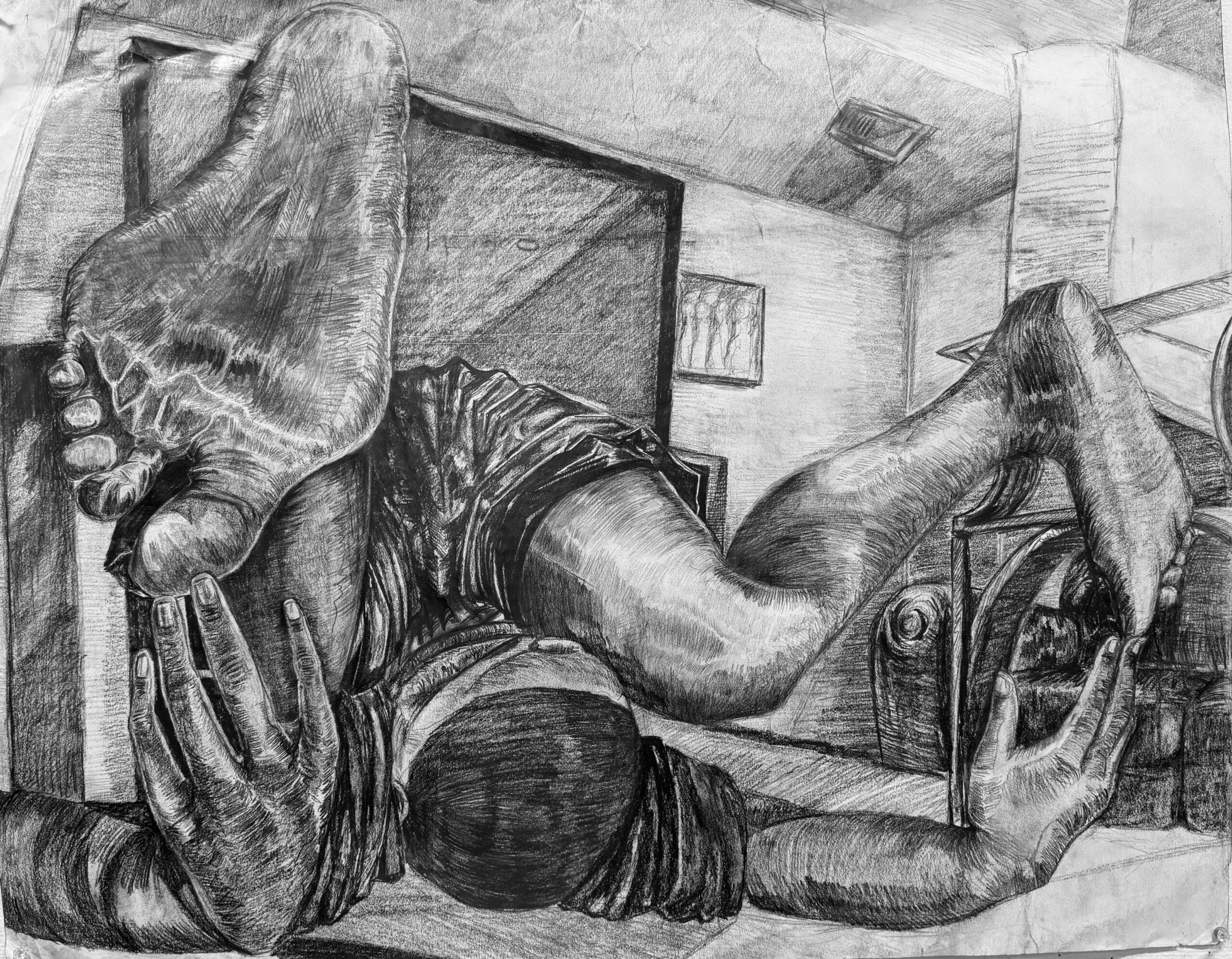 To me, that means that creativity should be continuously appreciated for the things it can bring, rather than limited or put downāand this can be reflected almost perfectly in the theme behind my work. My piece, a 32" x 24" graphite drawing, is titled "Artistic Licence," and represents "the freedom to do, just because you can," or what I call "artistic freedom." The randomness of the pose draws your eye around the piece in the way a conventional sitting, or standing pose wouldn't, and that is further emphasized by the worm's eye view perspective created from using an angle in environment and figure. It was my first time doing something like this, yet because I was given the freedom to choose my own medium, concept, and how I created my work, I was able to make something like this out of just an idea. If the Wright brothers weren't supported in the creation of their first plane, would aero technology be as advanced as it is now? And If Nikola Tesla's ideas for the Tesla tower were shunned, would we have electricity? Creativity is evolution, and with evolution comes things that we all benefit from, and that is artistic freedom. The freedom to do, just because you can.