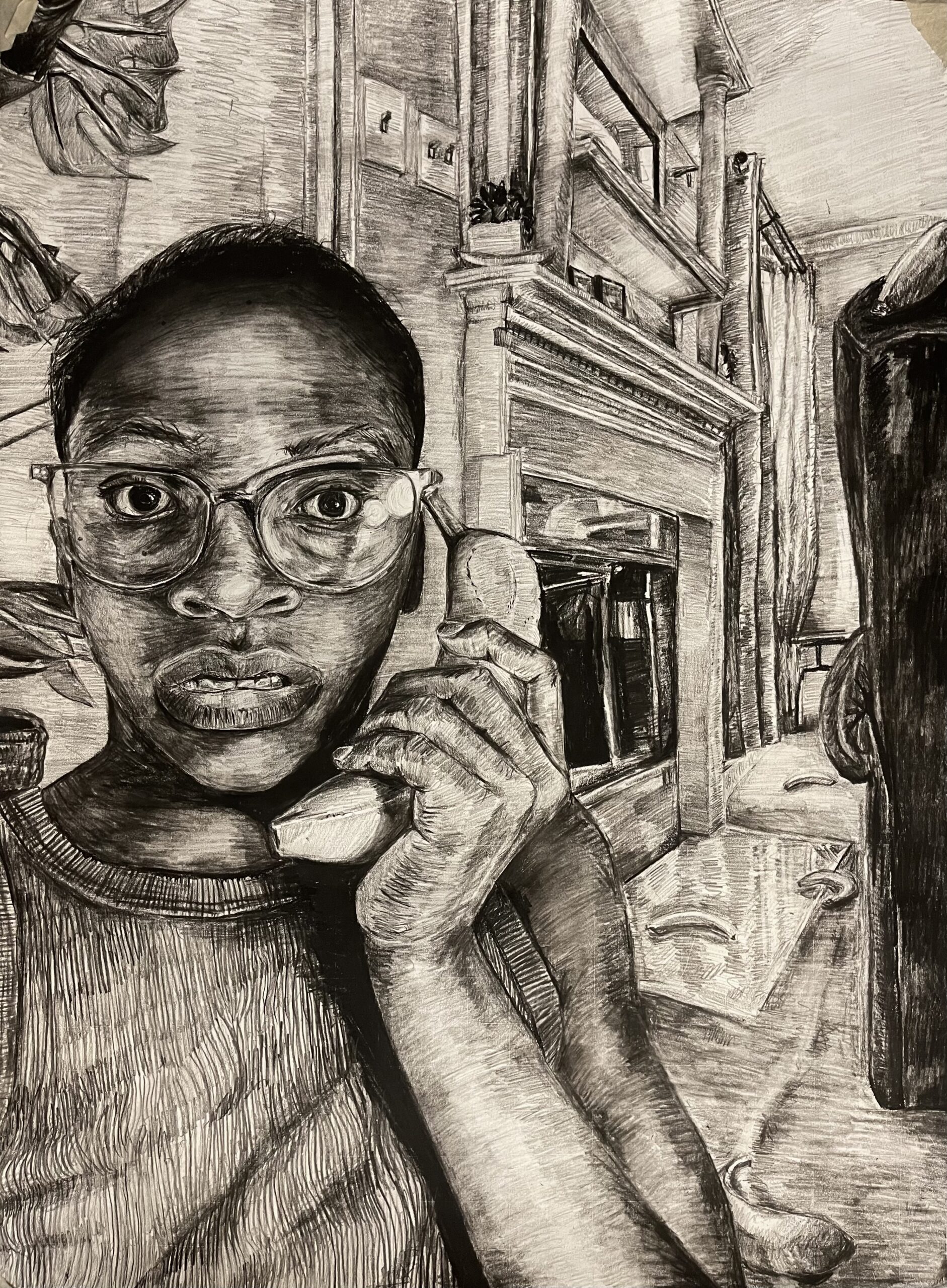 This piece uses symbolism to critique hustle culture by showing that money and constant work do not guarantee happiness. By creatively challenging the idea that progress equals productivity, the work reflects Carverās belief that new developments come from rethinking harmful systems and imagining healthier paths forward for the Black community.