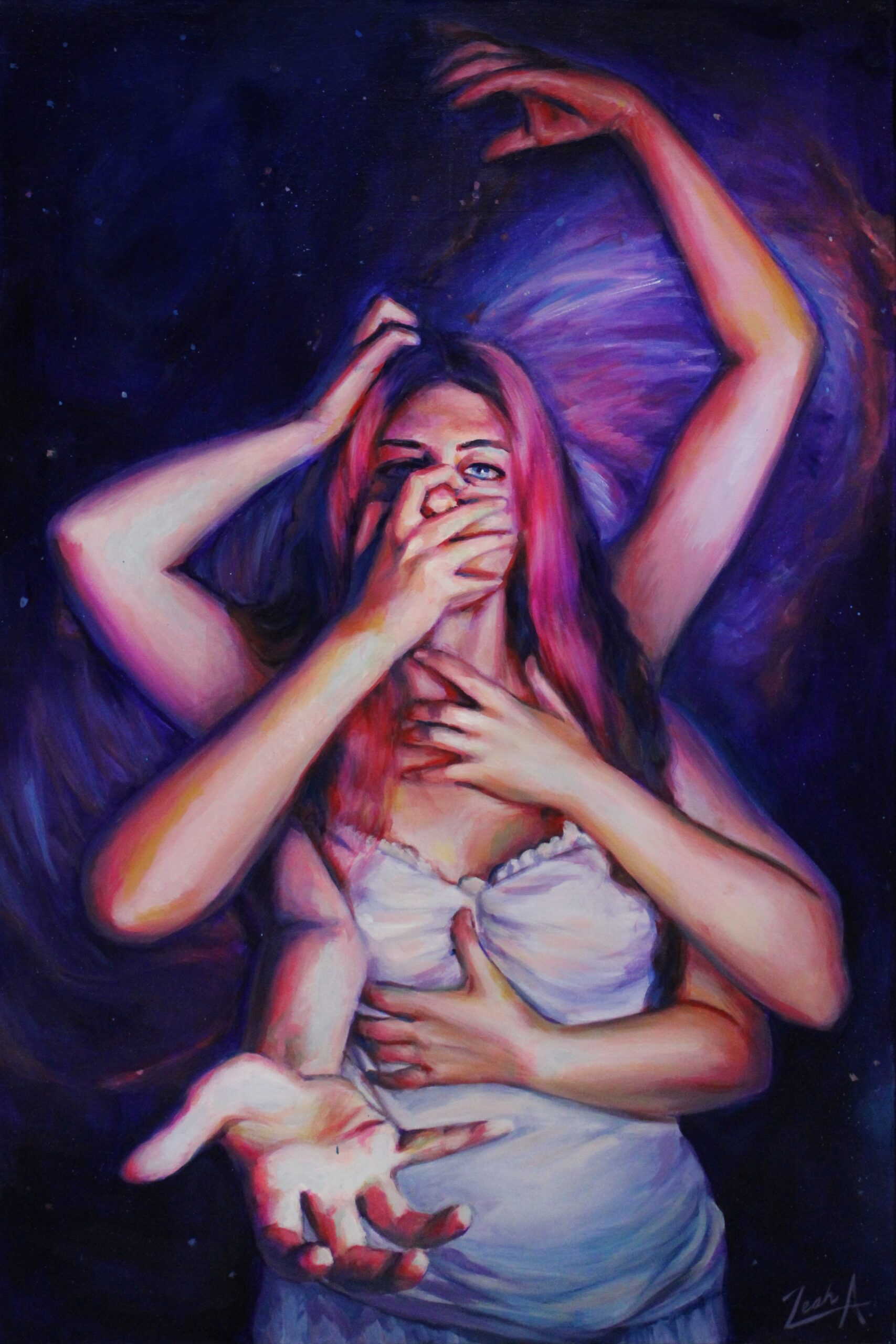 Without creativity, there'd be nothing: no art, no science, no thriving society, and no drive to develop oneself. My work reflects the endless possibilities that creativity brings. With each arm representing a new prospective endeavor, my potential rises as high as the stars in the night sky. My lived experiences paint my sense of self with ideas, as I wear clothes as white as a blank canvas. Creativity is inherently unbound, and the more one attempts to grow into their full potential, the more daunting the task becomes. I painted this to explore a notion of my future, the embodiment of shoes I had not yet filled. My future self is still me, and exists based on my own experiences. I will continue to seek inspiration in every way the world affects me, to not only make art, but to develop as an individual and encourage others to do the same.
