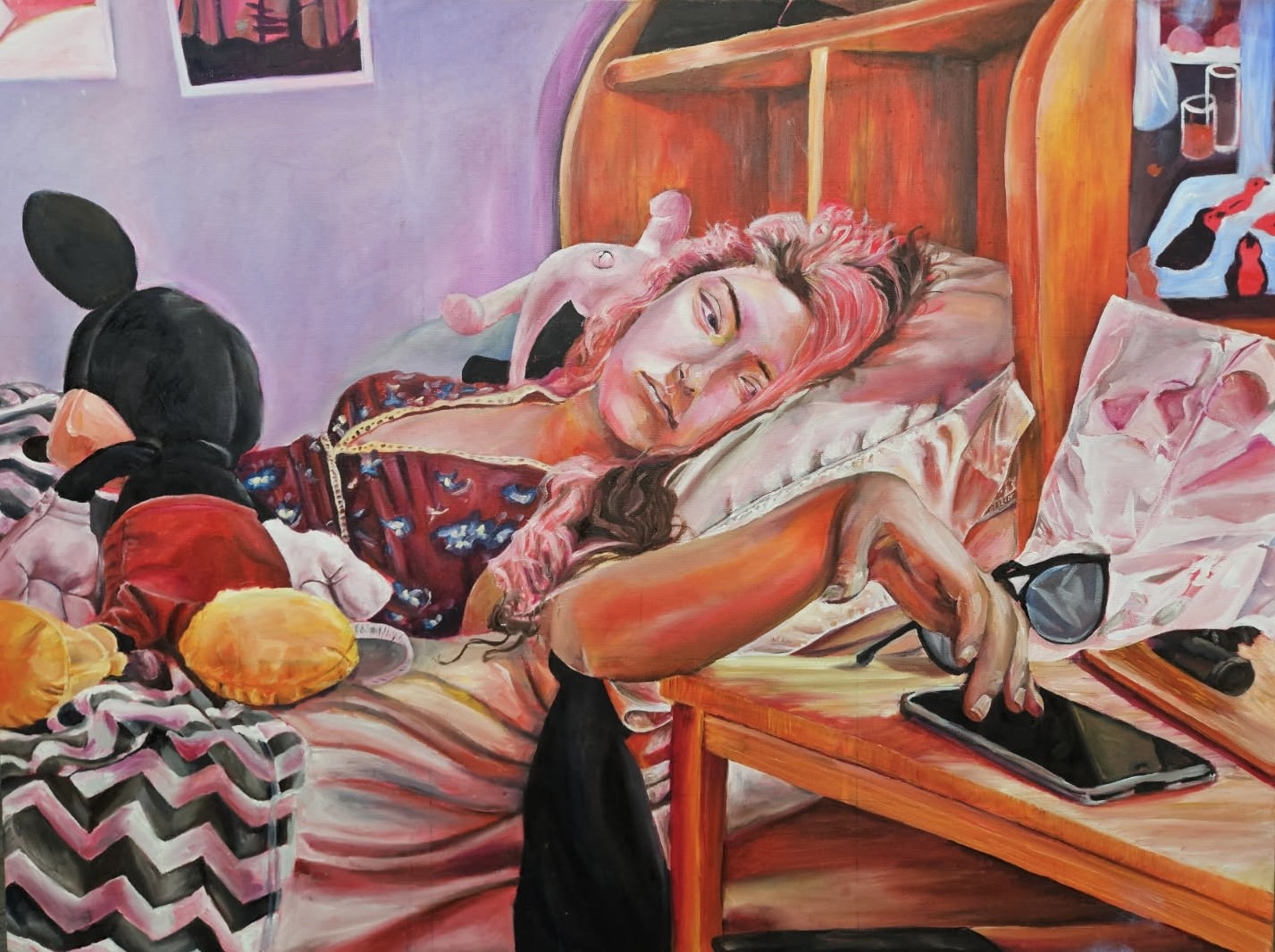 In this piece, I use bright, warm, neon colors and a vibrant and intimate composition to reflect the emotion that comes from connection and creative exchange. The hand reaching for the phone represents the tool that stimulates a source of ideas or inspiration. Notifications dinging, first thing in the morning, groggy, full of untapped conversations unfolding, and inspiration emerging from everyday moments. Surrounding the central figure are personal objects like plushies and posters, and a messy room, which ground the work in intimacy and individuality. These familiar items represent comfort, self-expression, and the private environments where creativity often begins.