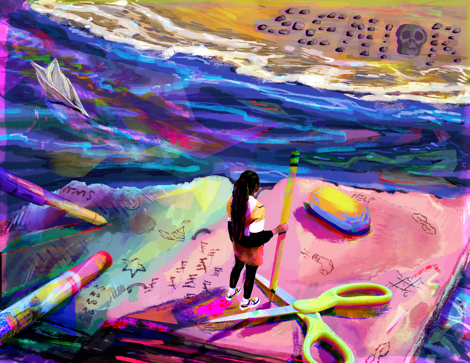 This piece, titled āLand Ho!ā details a small version of myself who has crossed the vast ocean. My binder-boat is battered, worn, and covered in doodles, evidence of my long journey in education. At long last, I have reached an island, only for it to be the deadly senior year.